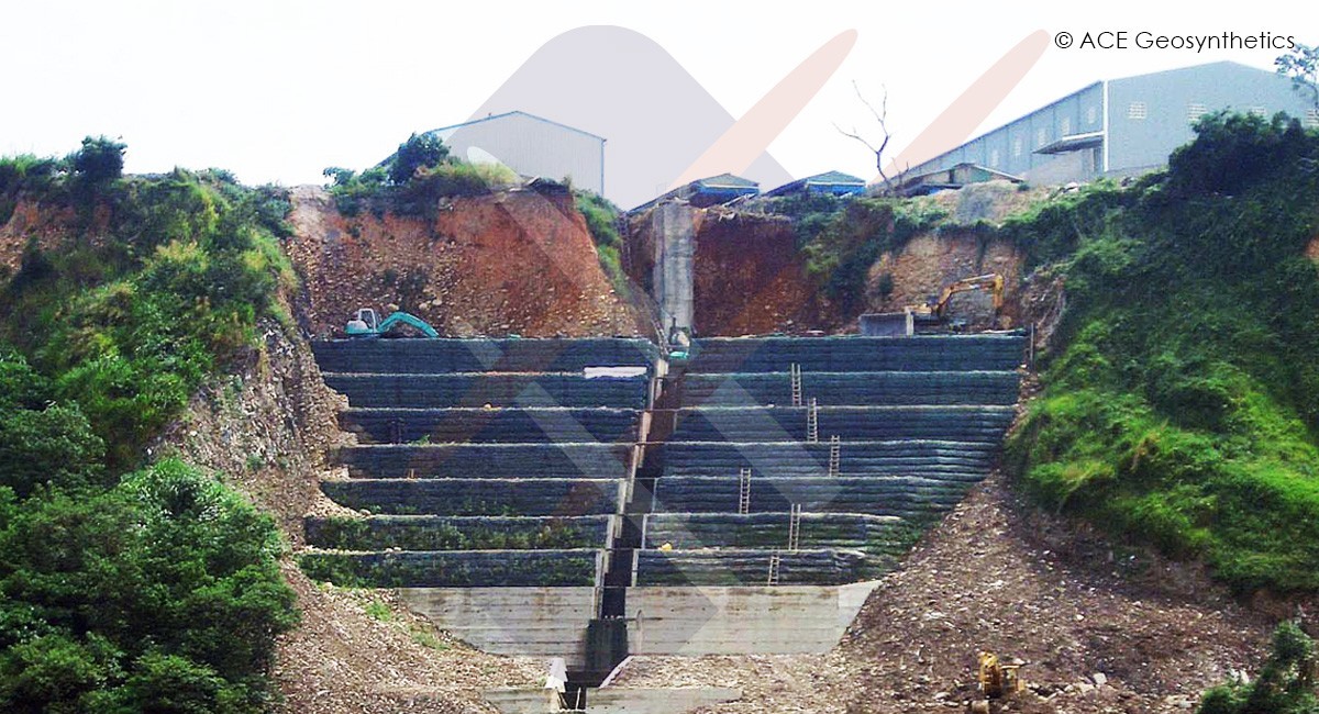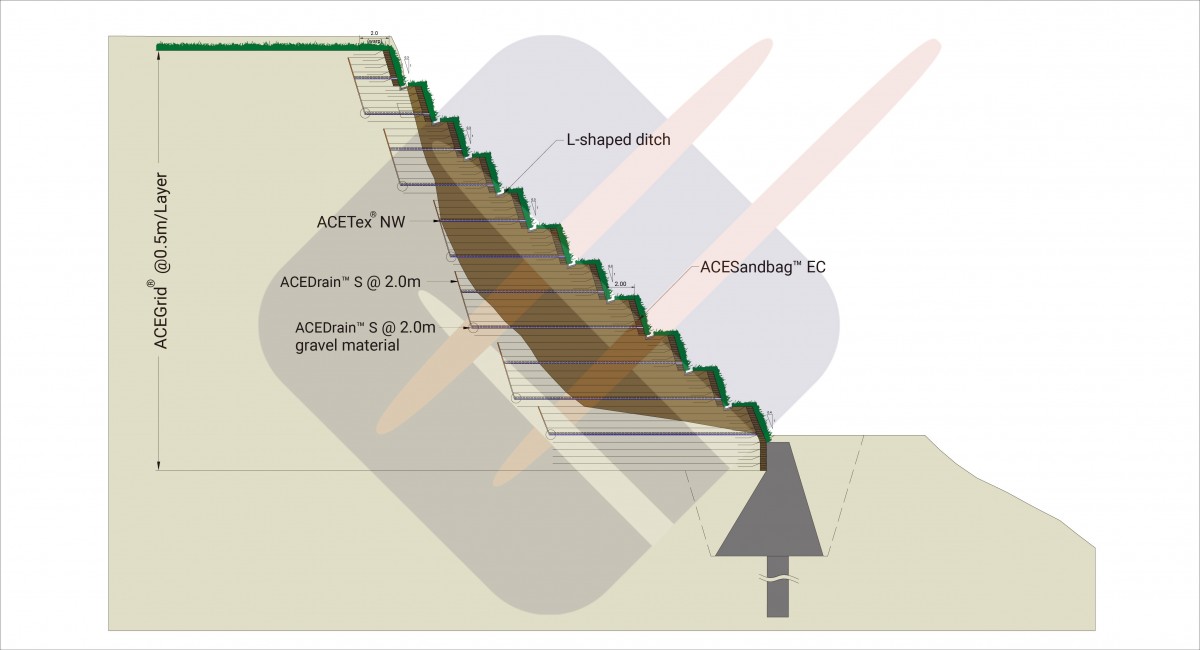 Considerando la seguridad, durabilidad y sostenibilidad, el diseñador adoptó finalmente Talud de Suelo Reforzado de ACE (RES por sus siglas en inglés) sistema compuesto para la rehabilitación. Basada en el análisis de estabilidad, pilas secantes y berma de pie; miembros estructurales de hormigón reforzado con rigidez más fuerte fueron instalados en el pie para ofrecer un suficiente apoyo de base. Luego, 11 niveles de talud de suelo reforzado (RES) usando ACEGrid® en los escombros que colapsaron en el sitio fueron puestos en secuencia hasta la cresta. El RES fue construido con geomalla de acabado envuelto con cada nivel a una altura de 3m y un porcentaje de inclinación de 1:2(H:V). Tablero de drenaje de ACE, tubería y geotextil (ACETex®) fueron ordenados como sistema de intercepción en el (RES) para disipación de filtración.