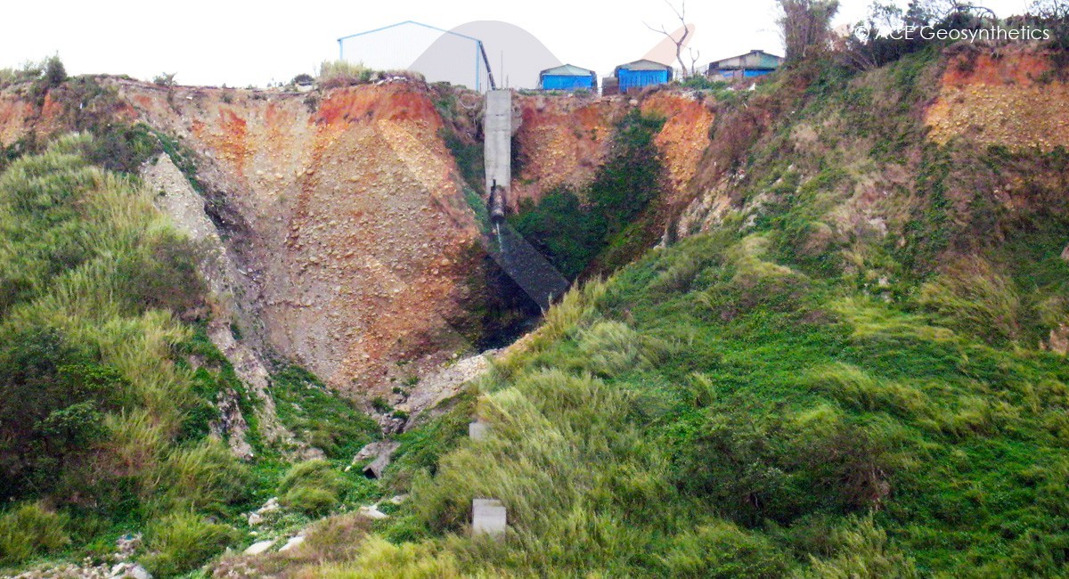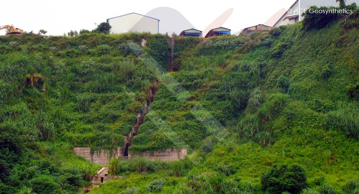 Considerando la seguridad, durabilidad y sostenibilidad, el diseñador adoptó finalmente Talud de Suelo Reforzado de ACE (RES por sus siglas en inglés) sistema compuesto para la rehabilitación. Basada en el análisis de estabilidad, pilas secantes y berma de pie; miembros estructurales de hormigón reforzado con rigidez más fuerte fueron instalados en el pie para ofrecer un suficiente apoyo de base. Luego, 11 niveles de talud de suelo reforzado (RES) usando ACEGrid® en los escombros que colapsaron en el sitio fueron puestos en secuencia hasta la cresta. El RES fue construido con geomalla de acabado envuelto con cada nivel a una altura de 3m y un porcentaje de inclinación de 1:2(H:V). Tablero de drenaje de ACE, tubería y geotextil (ACETex®) fueron ordenados como sistema de intercepción en el (RES) para disipación de filtración.