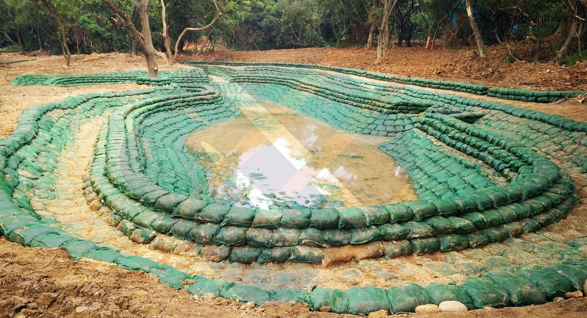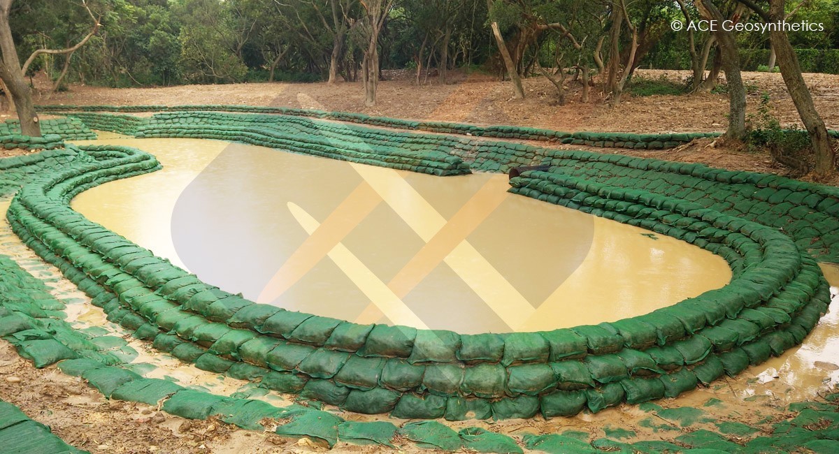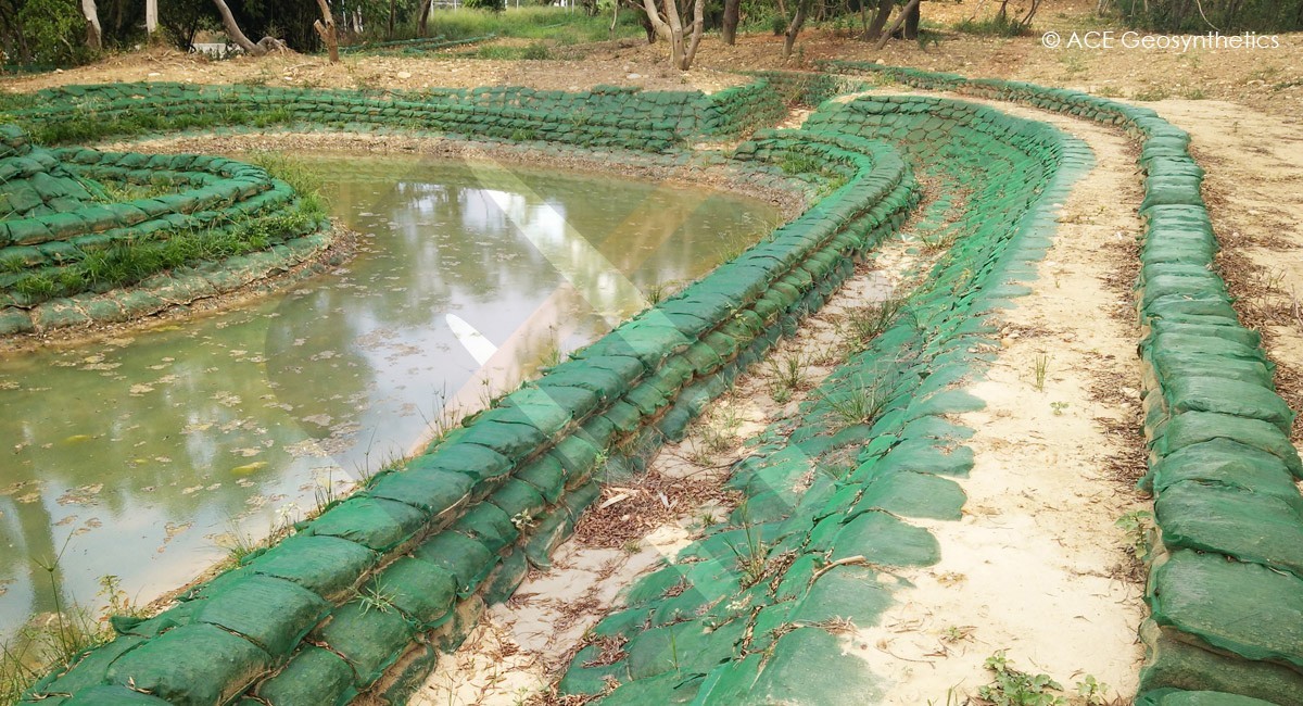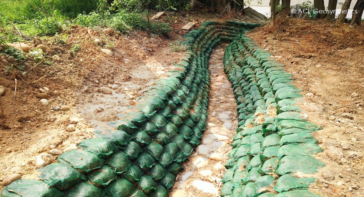 Para mejorar la capacidad de drenaje, evitar la erosión del suelo y proteger el medio ambiente, en el proyecto se aplicaron alrededor de 30.000 piezas de ACESandbag™ EC. Después del llenado, los constructores pueden instalar ACESandbag™ EC de acuerdo con el diseño de la zanja de drenaje y la pared del estanque de detención, los cuales son propicios para la condición del espacio en el crecimiento para volverse verde. La cuenca de detención está construida con el objetivo de trabajar la disipación de energía para el flujo de drenaje; la construcción adopta un diseño de dos capas y apila sacos de arena al lado del borde exterior de la segunda capa. El método de instalación puede amortiguar eficazmente el flujo de agua que fluye de arriba hacia abajo y evitar que el agua fluya hacia abajo para dañar el fondo del depósito de detención.