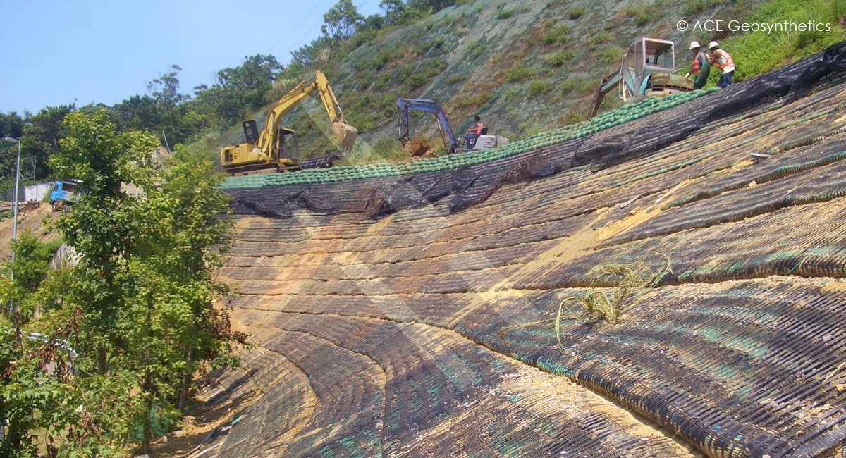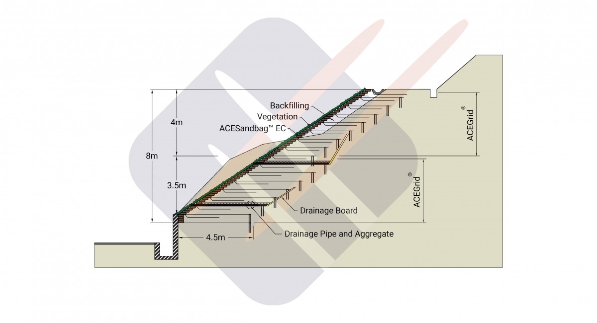 Giải pháp truyền thống là xây dựng khung dầm bê tông cốt thép đổ tại chỗ (RC) và lấp đầy bằng các túi cát chứa hạt thực vật. Nhưng thiết kế như vậy sẽ rất tốn kém và khung RC yêu cầu lượng lớn nhân lực và vật liệu cho việc thi công. Hơn nữa, đó cũng không phải là giải pháp bền vững. Để hoàn thiện bề mặt cũng cần thời gian tương đối lâu để thực vật có thể phủ hết bề mặt bê tông cốt thép. Để đáp ứng tất cả các yêu cầu của dự án, cấu trúc đất gia cường với bề mặt bọc cuộn (RES) bao gồm lưới địa kỹ thuật ACEGrid®, túi đất, đất tại chỗ và vật liệu thoát nước được lựa chọn để phục hồi mái dốc. Có 5 lý do để áp dụng giải pháp này: (1) chất lượng tuyệt vời và bền bỉ của ACEGrid® đảm bảo tính ổn định của RES; (2) hệ thống thoát nước dọc và ngang được thiết kế hợp lý; (3) thi công nhanh giúp giảm đáng kể ảnh hưởng đến giao thông; (4) hệ thống bề mặt bọc cuộn linh hoạt với thay đổi địa hình xung quanh; (5) cấu trúc bề mặt của RES tạo môi trường thân thiện cho sự phát triển của thảm thực vật và hệ sinh thái địa phương.